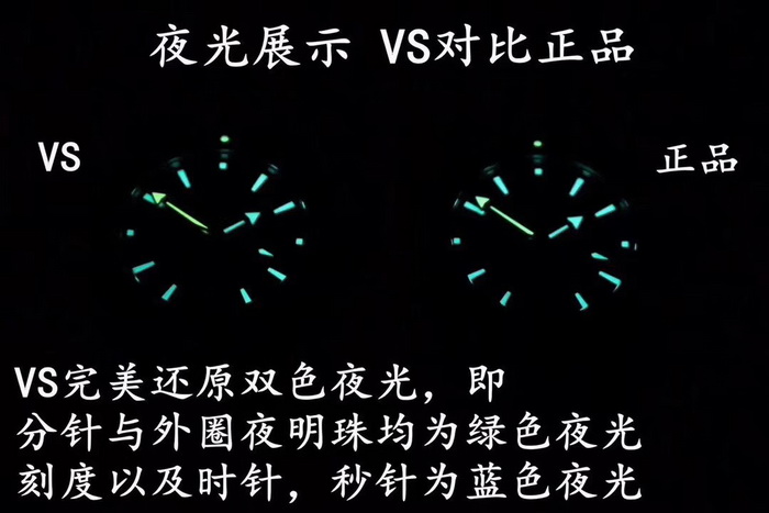 Светосветящее покрытие на точке на ребре браслета (pip на браслете) и минутной стрелке часов имеет зеленый цвет, в то время как на часовых обозначениях (hour markers) и на часовой стрелке оно имеет синий цвет. Этот дизайн делает чтение времени ночью для носителя более простым и удобным. Яркость светосветящего покрытия также совпадает с яркостью у оригинальной модели часов.