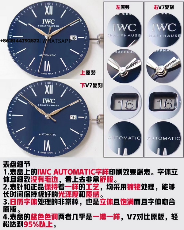 В 150-летии ЭDITION серии IWC Portofino циферблатные индикаторы сделаны с использованием старинного техниката печати чернилами. Копия также использует ту же технику печати чернилами, что и оригинал, как можно увидеть в сравнении ниже, где качество печати идентично. Фабрика-изготовитель копии обработала стрелки часового mechanism процессом «родирования», обеспечивая долговременный металлический блеск.