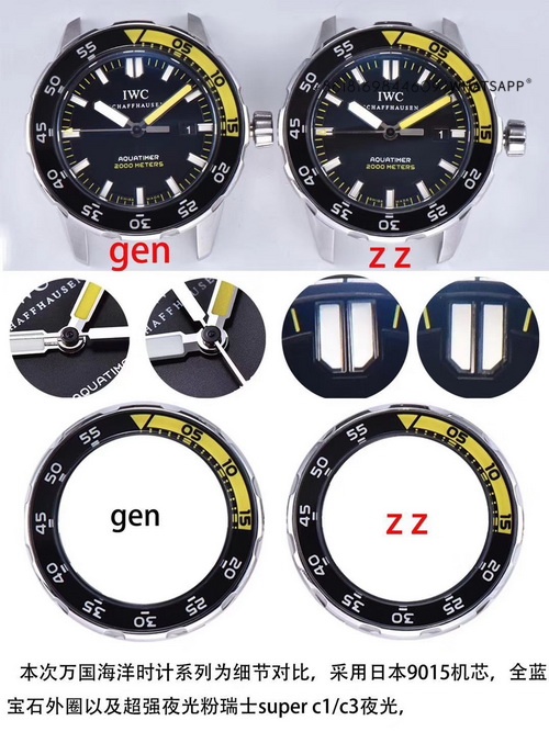 Многие могут не знать, что у IWC есть серия подводных часов, но сегодня мы представляем копию часов из серии IWC AQUATIMER. Размеры этогочасового модуля составляют 44 мм на 14 мм. На изображении ниже слева показаны оригинальные часы, а справа — копия.