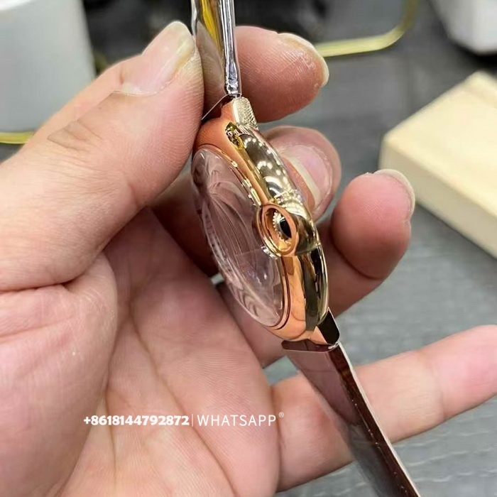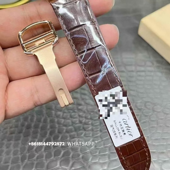 Эти часы BALLON BLEU DE CARTIER имеют диаметр 42 мм. Корпус выполнен из розового золота и дополнен кожаным ремешком с раскладной застёжкой.
