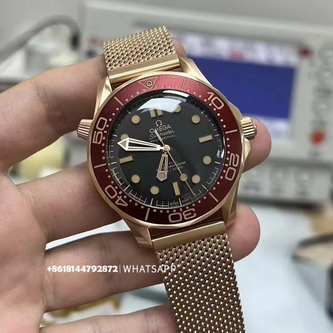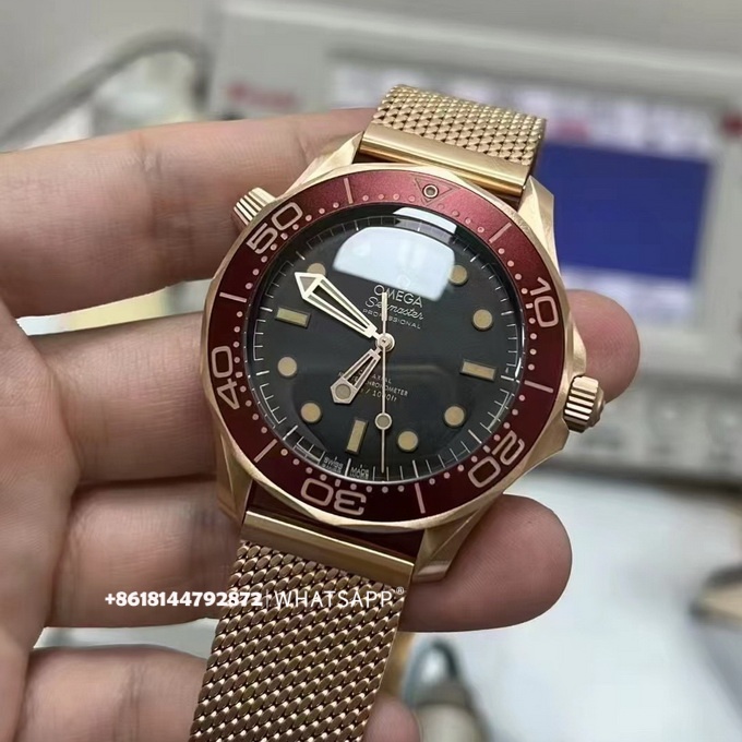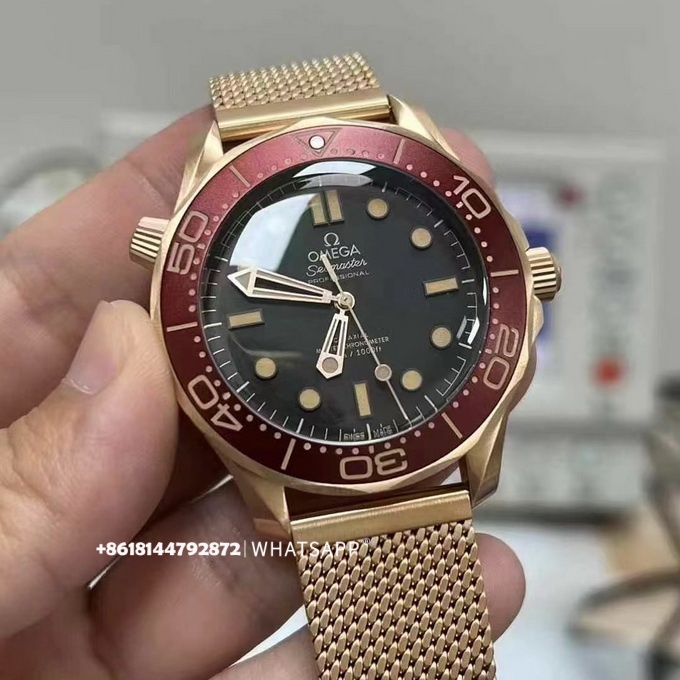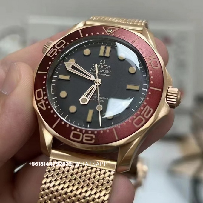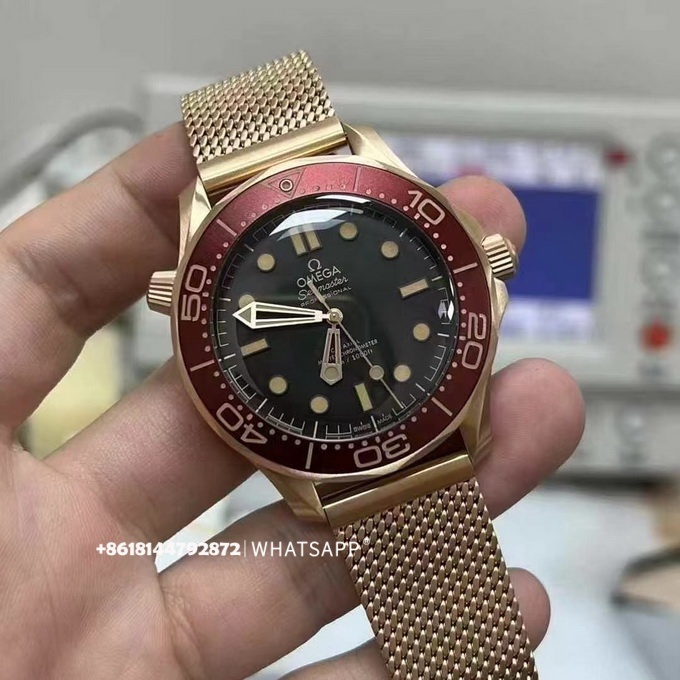 Безель выполнен в красном цвете (из материала на основе оксида алюминия). Модель поддерживает глубоководное погружение и является производной версией серии Omega Seamaster 300M.
