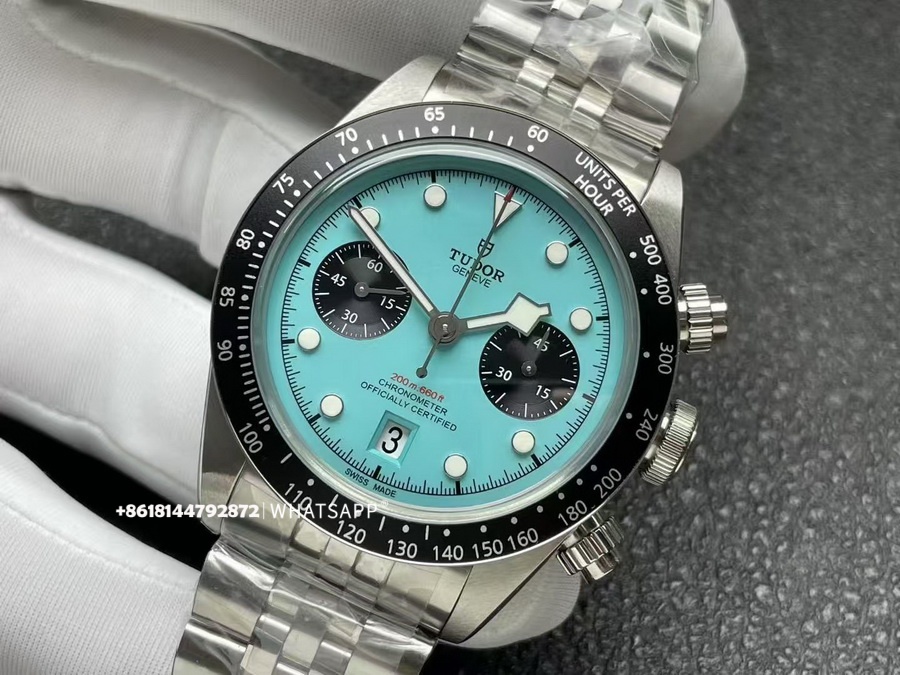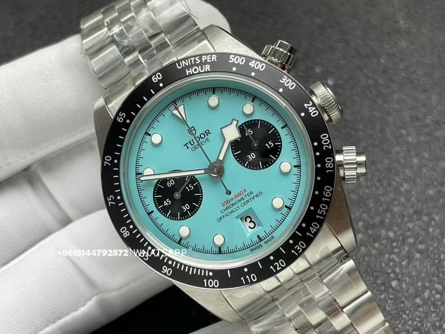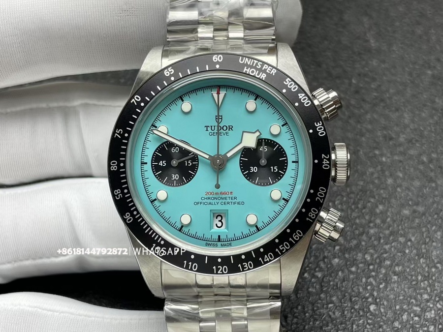 В прошлом году TUDOR выпустил новую модель в серии BLACK BAY CHRONO с эффектным циферблатом цвета «тиффани блю». Эта версия была воспроизведена фабрикой ZF в формате 1:1, с использованием хронографа 7750, который полностью повторяет все функции оригинального калибра MT5813. Безель выполнен по технологии анодированного алюминия, а размеры корпуса составляют 41 мм × 41,4 мм, при этом качество изготовления находится на очень высоком уровне.