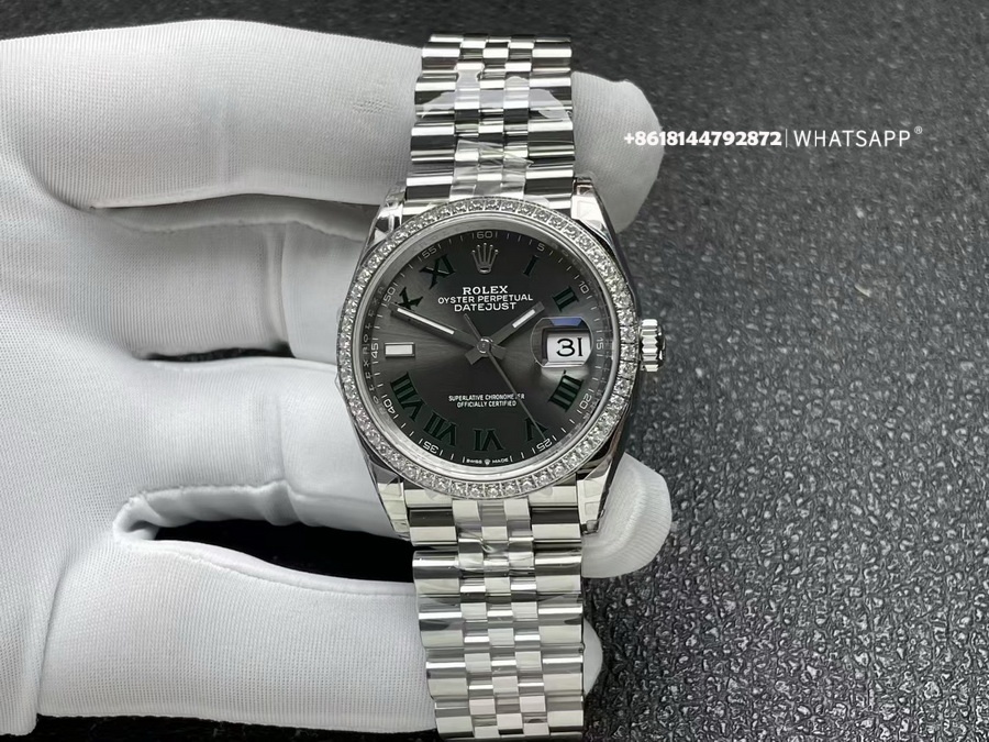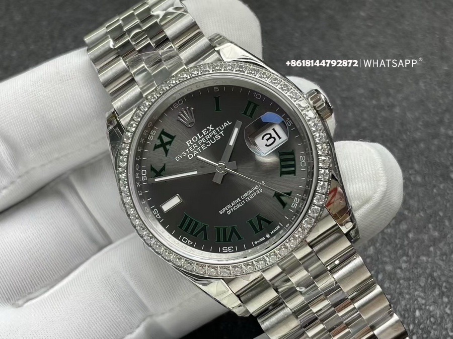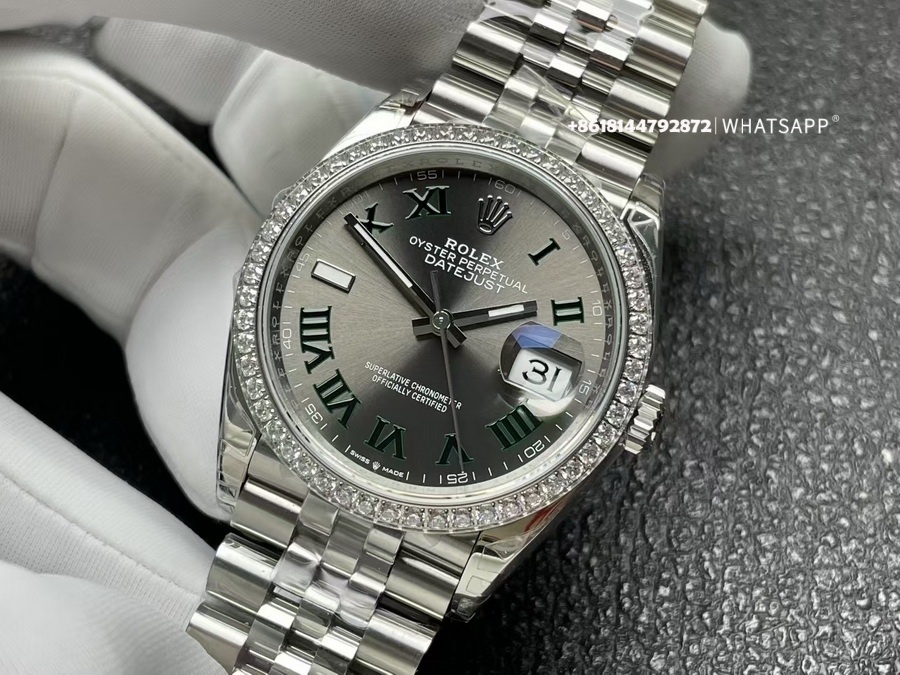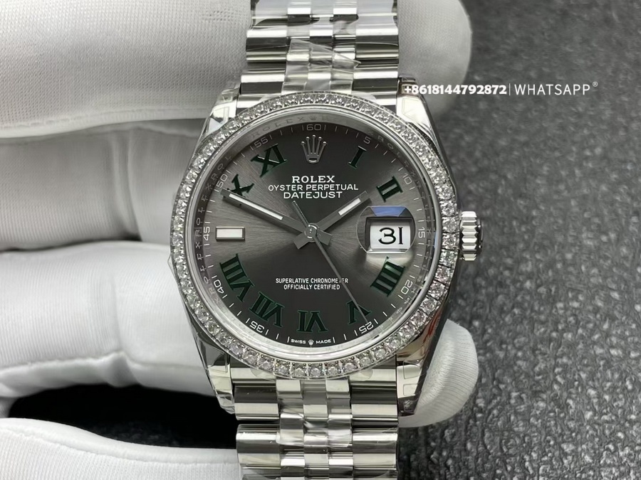 Эти часы Rolex Datejust имеют диаметр 36 мм, что делает их подходящими как для мужчин, так и для женщин. Безель инкрустирован бриллиантами, а серый циферблат украшен зелёными римскими цифрами в качестве часовых меток.
