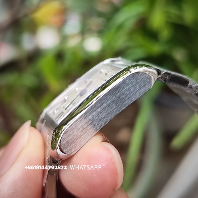Дамам, предпочитающим прямоугольные часы, стоит обратить внимание на эту модель. Также доступна версия с золотым браслетом. Часовые метки на этом циферблате инкрустированы бриллиантами, что придаёт дополнительную изысканность.