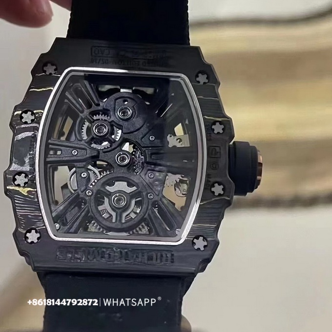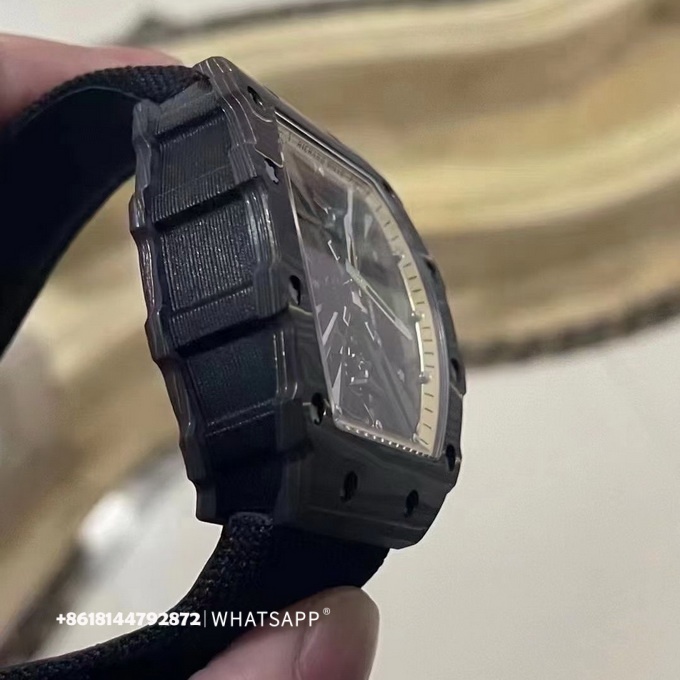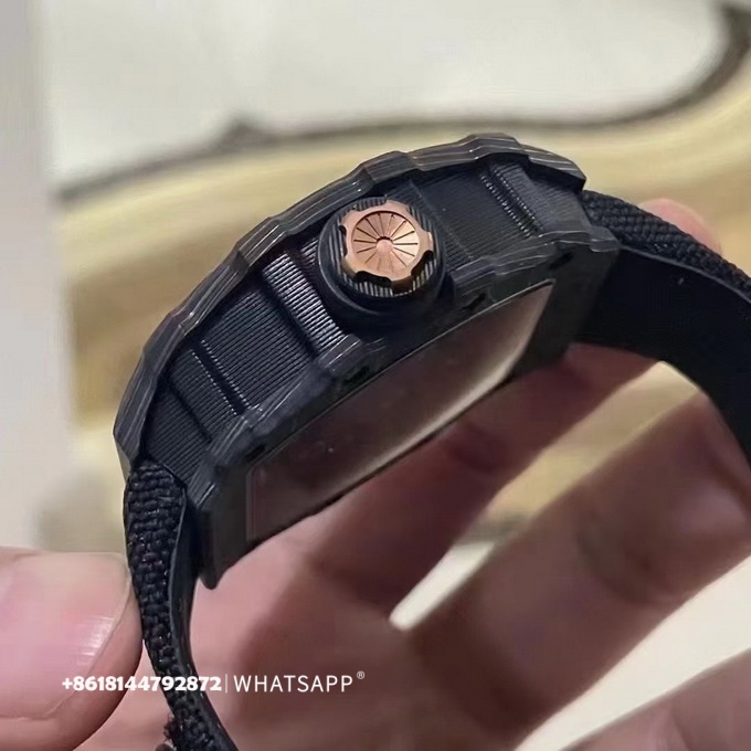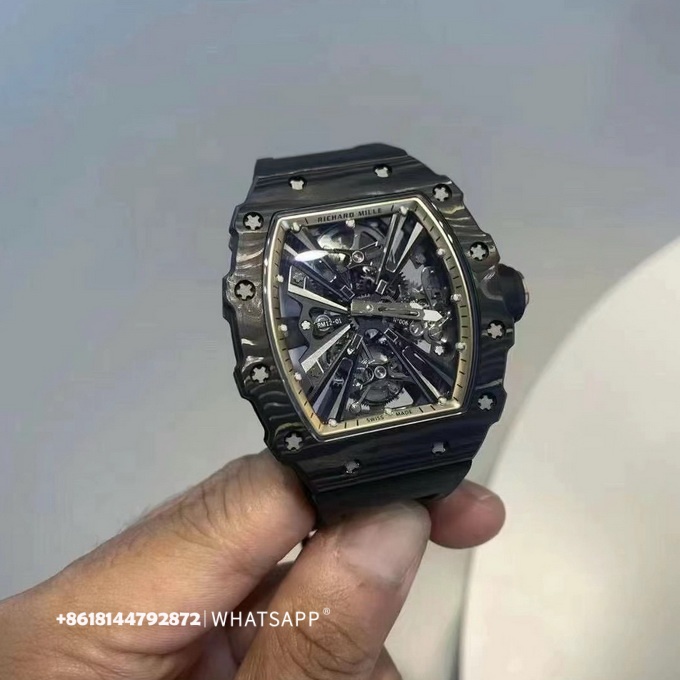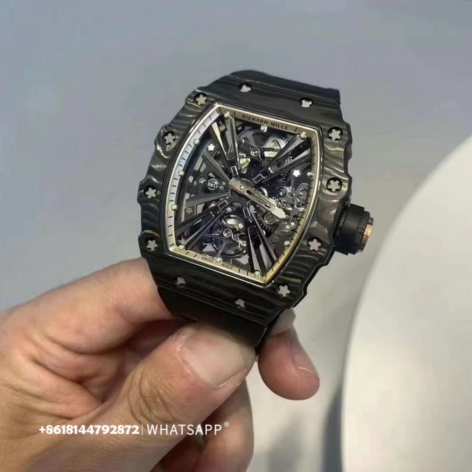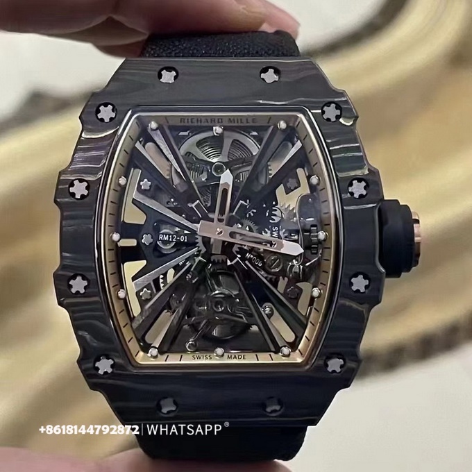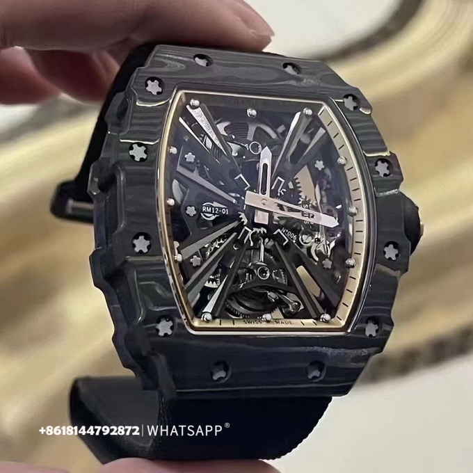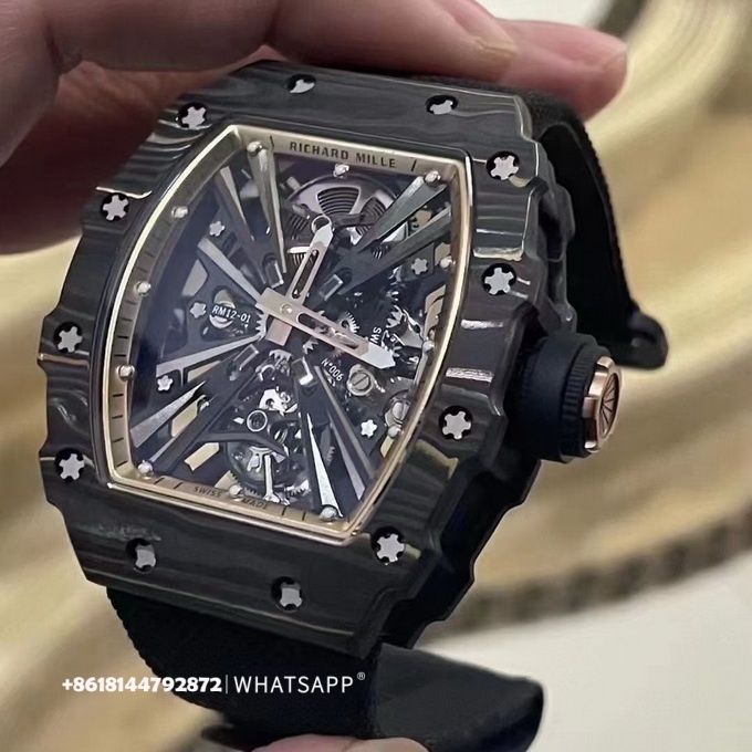 Часы имеют корпус бочкообразной формы, изготовленный из материала «Gold Carbon TPT», вес которого составляет всего несколько десятков грамм. Каждый корпус уникален благодаря неповторимому узору углеродного волокна. Углеродное волокно известно своей прочностью и лёгкостью, этот материал широко используется Richard Mille при производстве часов. Часы оснащены турбийонным механизмом с ручным заводом, максимально точно повторяющим внешний вид оригинала RM12-01. Часы Richard Mille зачастую отличаются сложным дизайном, и не каждая модель имеет реплику. На нашем сайте тщательно отбираются изделия с высокой степенью схожести для ознакомления клиентов.