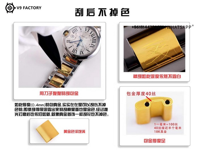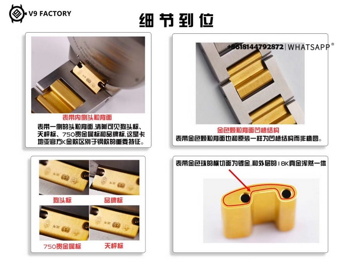 Изготовитель данной копии часов наносит золочное покрытие на каждый сегмент браслета, а толщина этого покрытия достигает 0,5 мм. Эта толщина позволяет браслету противостоять обычным царапам. Для обеспечения равномерного окрашивания каждый компонент отдельно плируется.